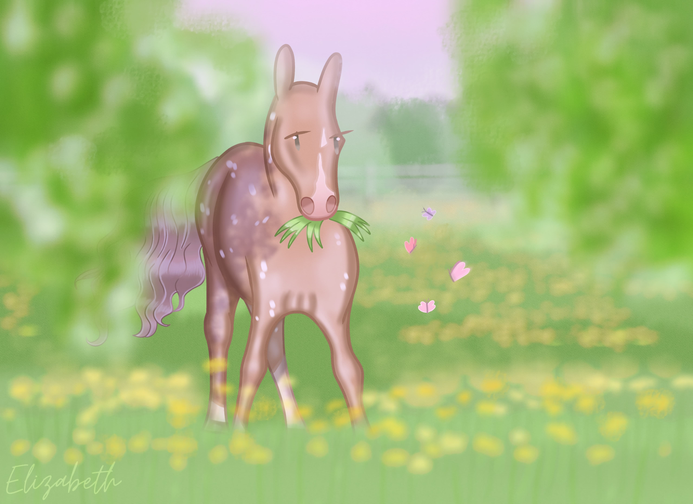 It was a beautiful morning, the birds were singing and the sun was just about to rise. The grass was covered with beautiful yellow flowers. Spiro was in the pasture nibbling on the green grass with butterflies flying next to the stallion. Suddenly Spiro's ear flicked forward and he noticed Sable, his owner. Spiro had a rather funny look on his face, surprised and bored, hoping that the woman wasn't here to take him away from here. I'd rather stay here in the pasture than come with you..