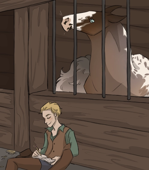 A snort from above him made him look up again, a devilish smile crawling over his face as he met the blue eyes that held cautious curiosity towards him. Mack raised his hand slowly, letting his knuckles run against the bars of the stall door and holding it there for a moment. A gust of a wet breath hit his knuckles before the stallion kicked at the stall door and turned around, huffing and puffing up a storm.
