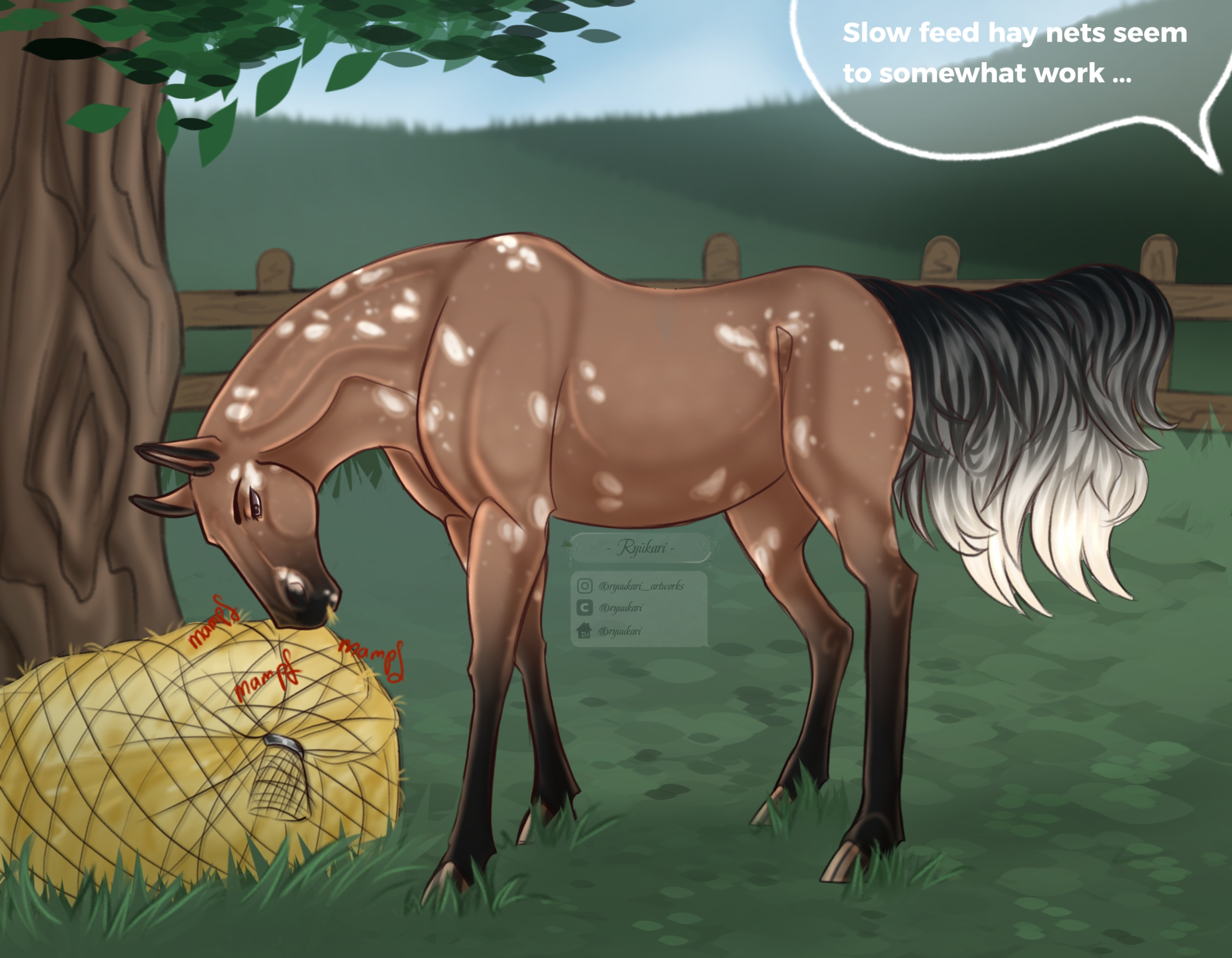 - Description: This horse seemingly hasn't been given enough to eat during its life, as it gets agiatated around feeding time and will bully other horses out of the way if fed in a group. Prone to kicking stall doors when food is arriving, and will often eat as fast as possible, leading to occasional choke and colic.