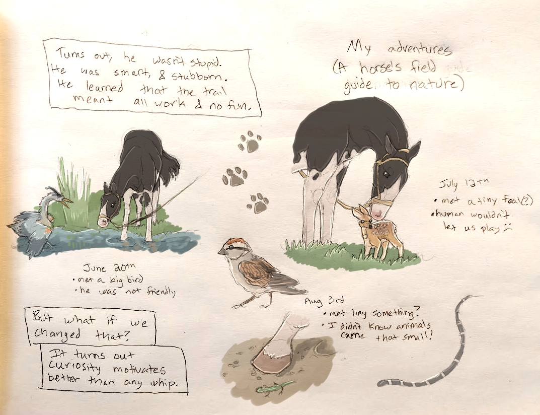This was a fun one to draw; and motivation here was more of a metaphorical sense. Instead of being incentivized by a treat or a scratch, 11084 really liked just discovering nature. He didn't get to do it much since his old owners would just push him forward along boring trails so he never got the chance to learn to like it. This was a nice bonus prompt, as it explored the horse's natures more, while my previous main phrase prompts moreseo explored the growth of the rider.