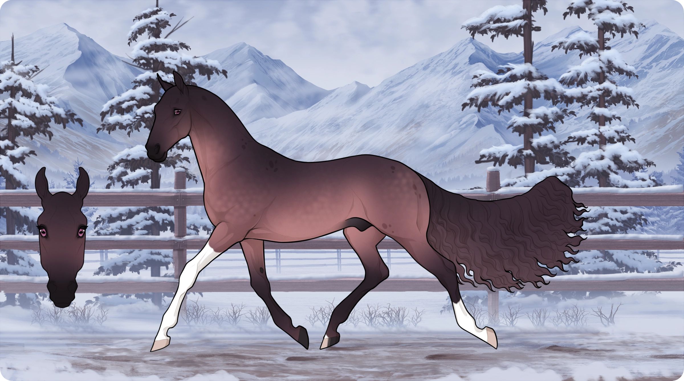 Jayce is a flashy Sooty Carnation Tobiano with grease spots - only he doesn't have any tobiano markings... He's a very sporty looking Loshie, with strong legs, and well-shaped body. He has a long rapunzel tail, that's brushed out neatly, and has a little wavy kinda look. He has pink-berry coloured eyes, and stands at seventeen point three hands (17.3hh).