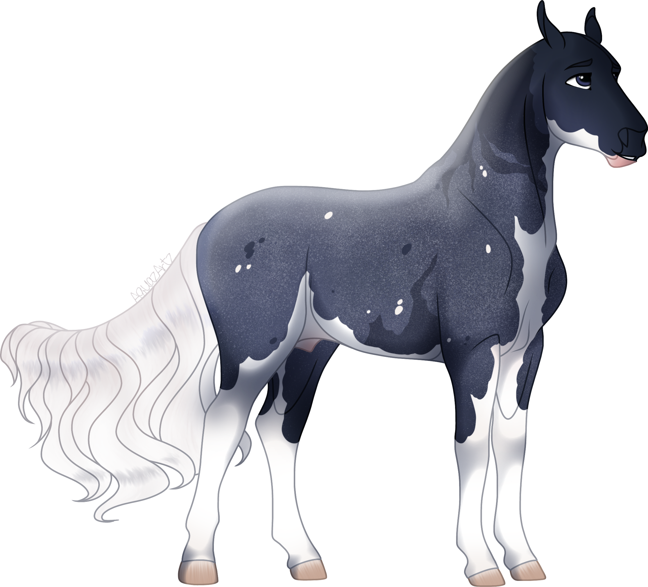Waylan is a very sporty looking fella, with a strong build, but slim body. He has dreamy navy blue eyes, that match his coat, with light mutations covering parts of his body. He has little birdcatcher spots with splash markings, and a long silky tail, that is typically groomed out and smooth. He typically stands tall and proud, and is seventeen hands (17hh) at the withers.