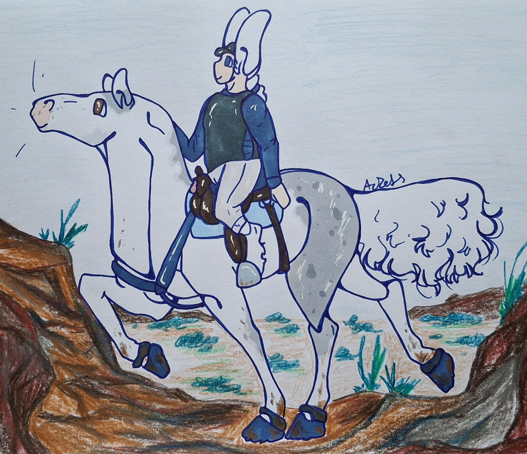 Azura and Bunny go on a ride trough some rough terrain! Theyre having a great time exploring and just being out together. Bunny is as surefooted as they come and Azura a skilled rider who helps balance her mount. They move swiftly and with astounding ease, making the climb appear almost like a walk in the park. Its made possible by years of trust and shared experience.