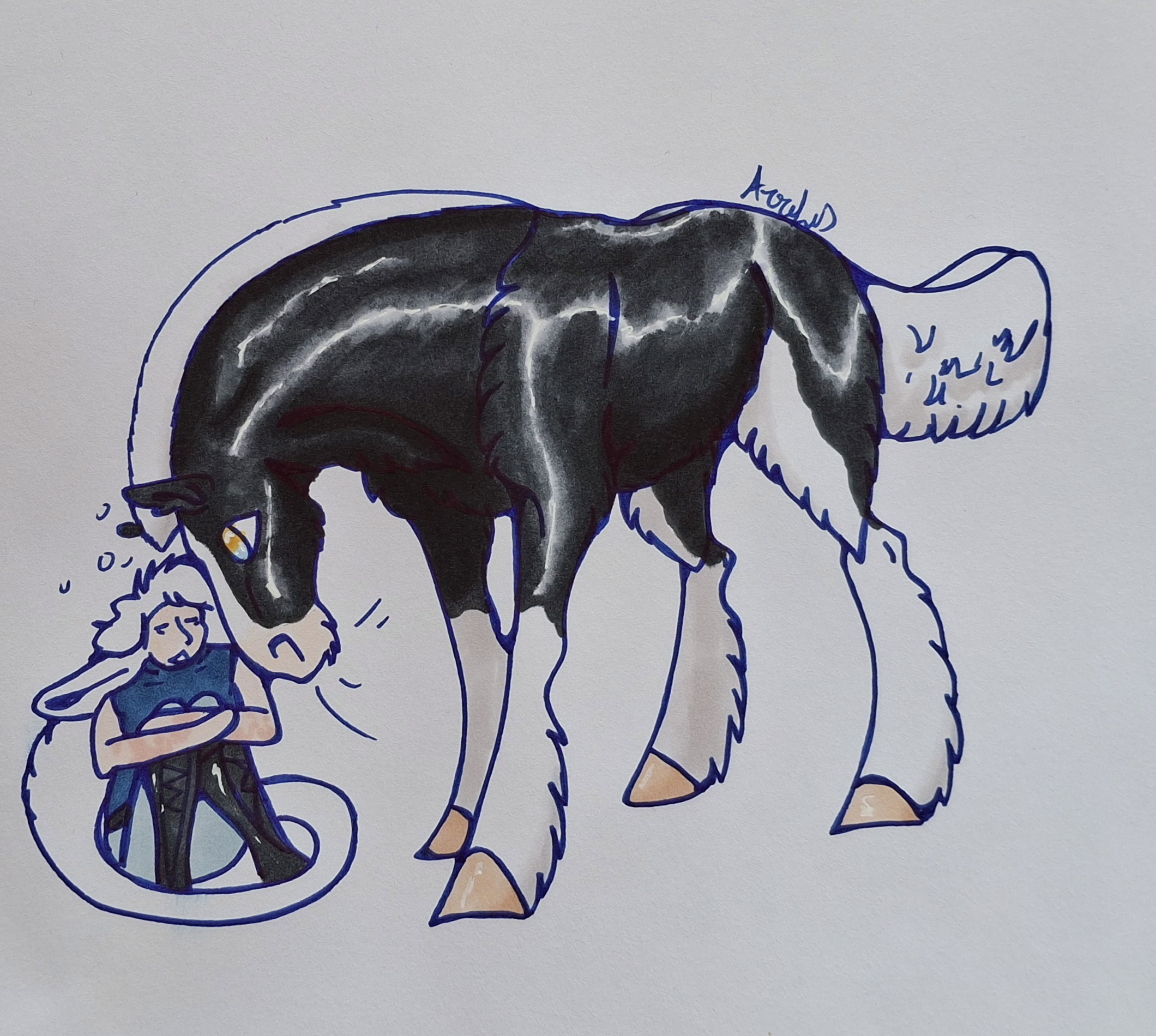 Scorch is very quiet. He doesnt neigh nor nicker, only grumbles or rumbles occasionally, mostly when with his owner. He can also be a quiet walker and approach his owner silently. Sometimes she turns around only to have him a centimeter from her face, watching her intently with a "pet me pls!" written into his eyes and posture. So when shes hit with a bout of sleepieness after overworking herself, she finds Scorch watching (over) her.
